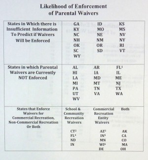 As the number of states enforcing parental waivers from one in the early ‘90’s to 14 now, there seems to be a definite trend toward enforcement. Almost certainly, courts in some of the 19 states in which parental waivers have not been challenged in court (see the table) will enforce these waivers in the future.